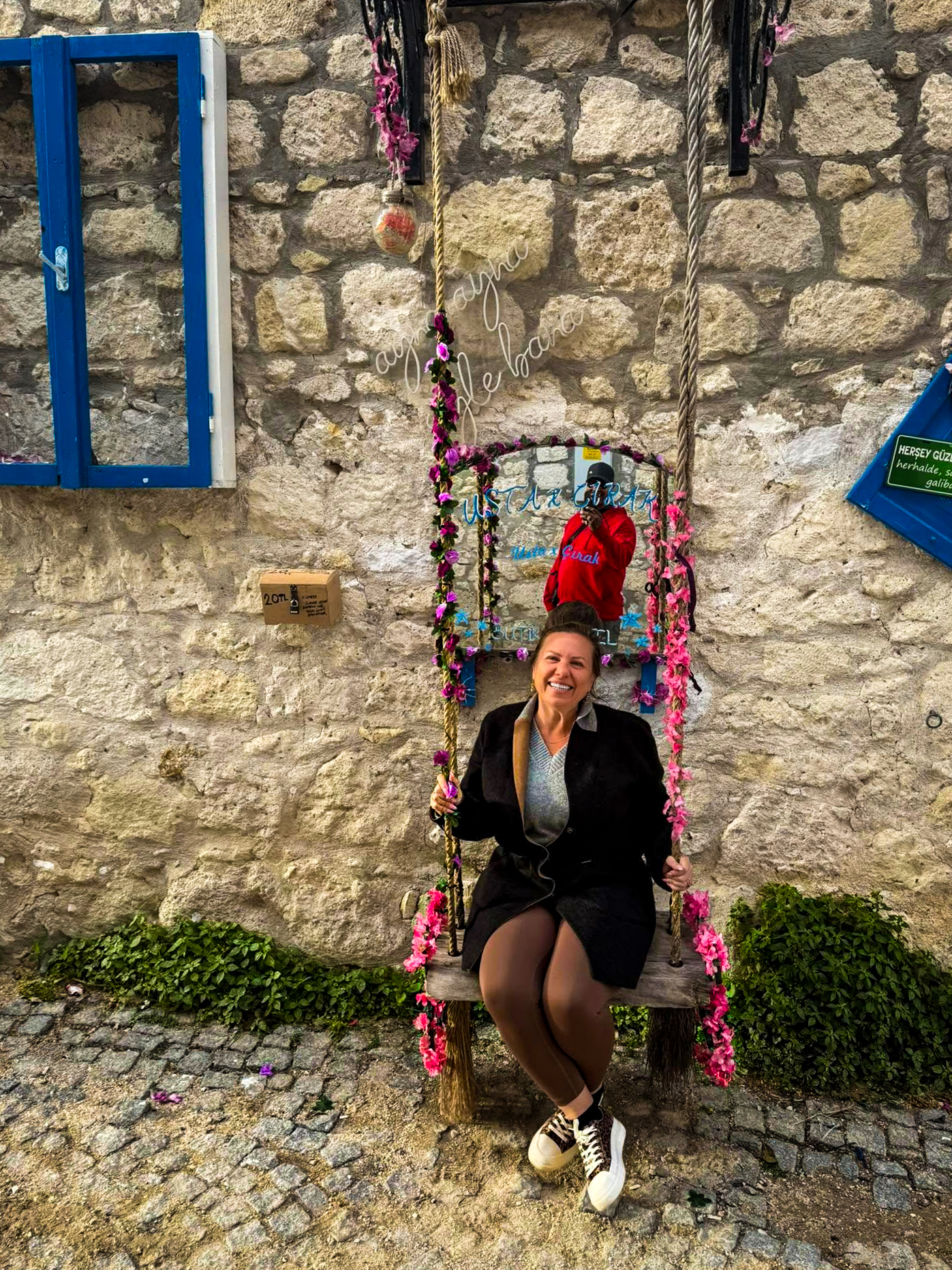 But I also felt that sense of history in more intimate corners. I recall an afternoon strolling through the streets of a coastal village. Whitewashed stone walls, vibrant turquoise windows, and the scent of bougainvillea in the air (image). Sitting on that swing decorated with flowers was a moment of absolute peace, a respite in the midst of my exploration that I still cherish. Those small details, that blend of the ancient and the everyday, are what make Turkey so special.